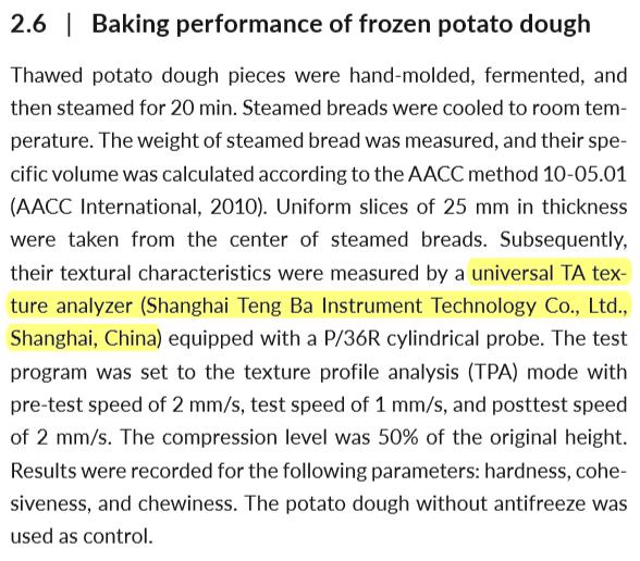 在该研究论文中,研究人员利用上海腾拔的Universal TA研究型国产质构仪用于测定马铃薯面包的硬度、回复性、内聚性和咀嚼性等指标。