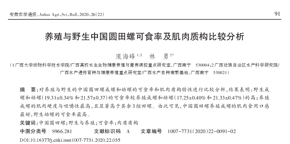 摘要:对养殖与野生的中国圆田螺成螺和幼螺的可食率和肌肉质构特性进行比较分析,结果表明:野生成螺和幼螺(19.31±0.34%和21.57±0.37)的可食率较养殖成螺和幼螺(17.25±0.40%和21.33±0.47%)的高;养殖成螺的肌肉硬度与咀嚼性高,且显著高于其余3组田螺。由此可见,中国圆田螺养殖成螺的肌肉食用口感好,野生幼螺的可食率高。