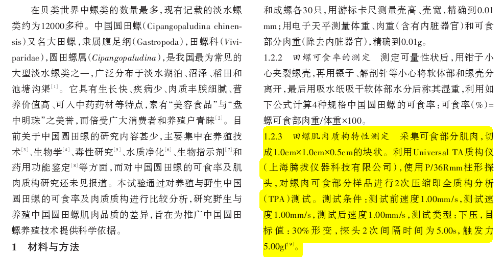 2020年,广西壮族自治区水产科学研究院和广西大学动物科学技术学院研究人员在国内期刊《安徽农学通报》在线发表了题为“养殖与野生中国圆田螺可食率及肌肉质构比较分析"的研究文章。在该论文中,研究人员使用上海腾拔仪器科技有限公司的Universal TA质构仪来测定田螺肌肉的硬度、弹性、回复性、内聚性和咀嚼性指标。