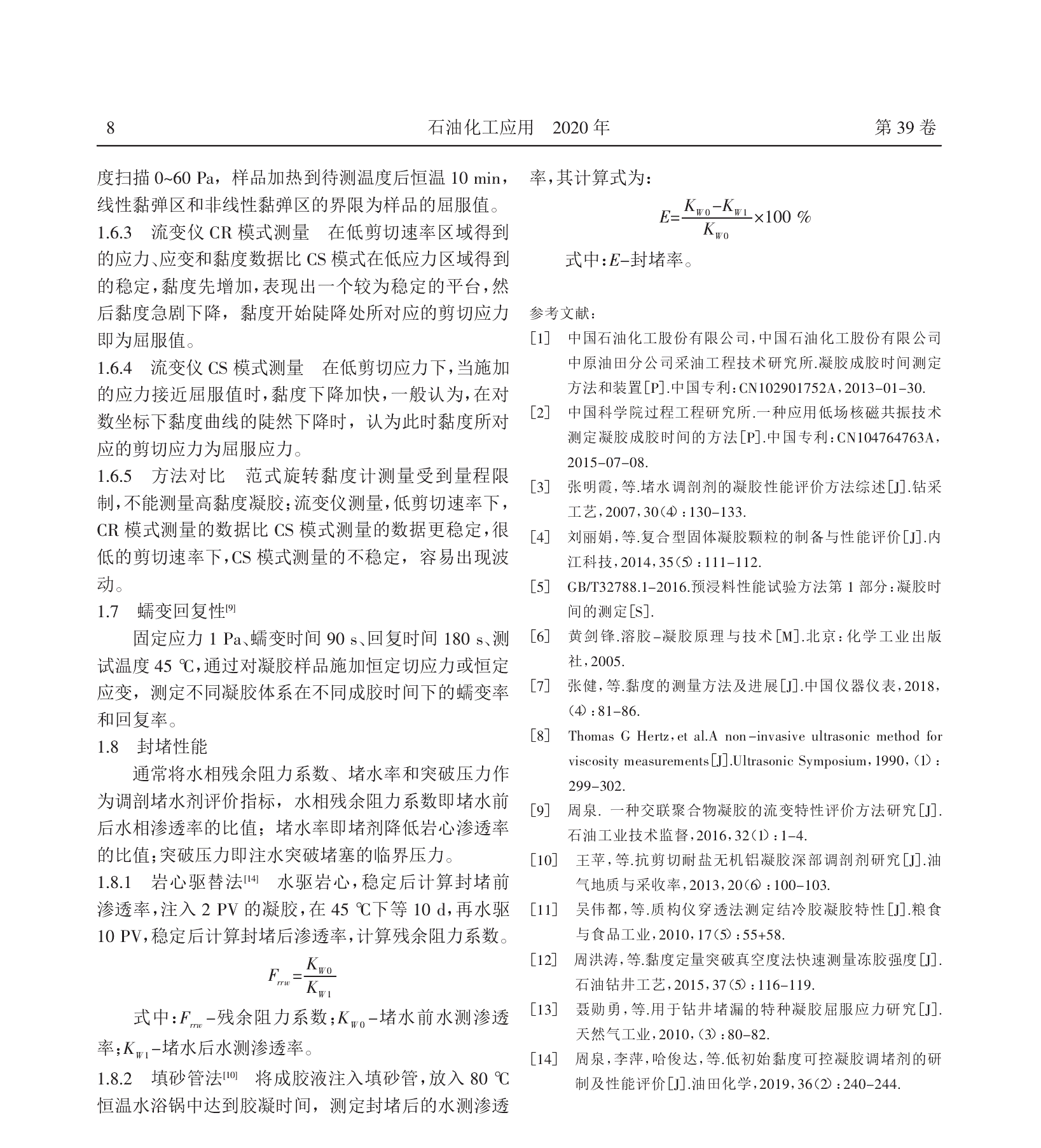 凝胶作为常用的封堵材料,在老油田控水稳油中有重要的地位,研究其性能显得至关重要。本文通过实验和查找文献,介绍了凝胶性能测定及评价,包括凝胶的成胶时间、黏度、黏弹性、抗剪切性能、强度、屈服应力、蠕变回复性和封堵性能。通过对凝胶性能测定及评价综述,为实验研究、现场工作中凝胶性能及评价提供全新的参考。