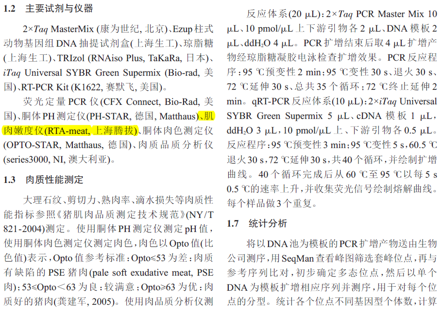 2018年,贵州大学动物科学学院研究人员在国内期刊《农业生物技术学报》在线发表了题为“江口萝卜猪UCP3 基因变异及其表达量与肉质性状关联性分析"的研究文章。在该论文中,研究人员使用上海腾拔仪器科技有限公司的RTA-Meat肌肉嫩度仪来测定猪肉的剪切力。