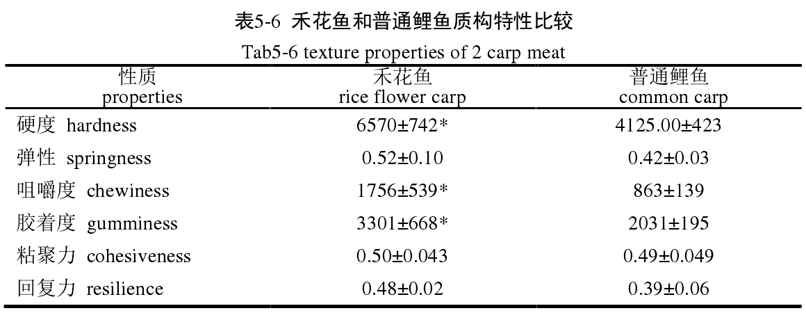 禾花鱼和普通鲤鱼肌肉在弹性、粘聚力、回复力方面无显著差异,但禾花鱼的硬度、咀嚼度、胶着度均显著大于普通鲤鱼。