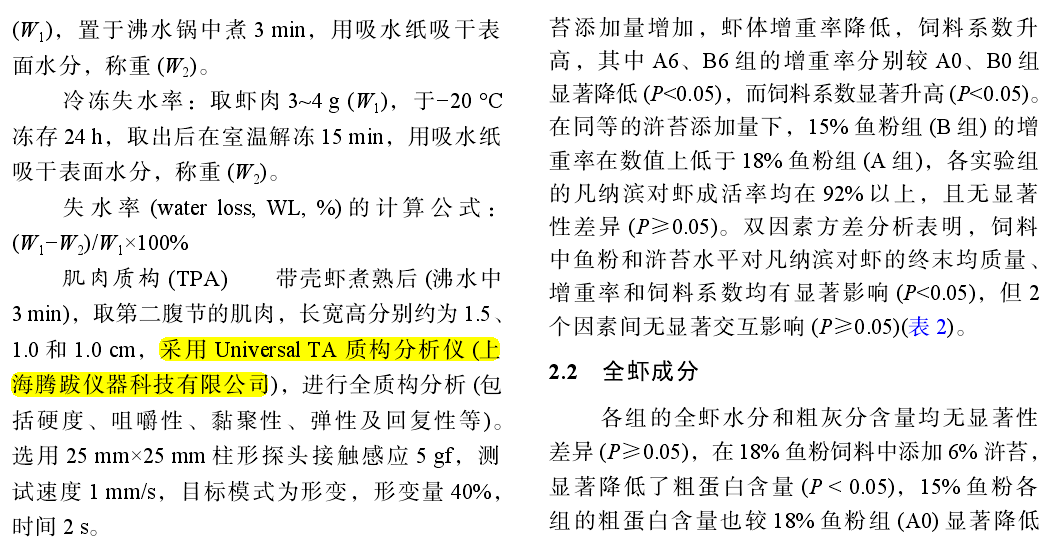 2021年,上海海洋大学研究人员在国内期刊《水产学报》在线发表了题为“饲料中添加浒苔对凡纳滨对虾生长性能和肌肉品质的影响”的研究文章。在该论文中,研究人员使用上海腾拔仪器科技有限公司的Universal TA质构仪来测定凡纳滨对虾的硬度、弹性、咀嚼性、黏聚性和回复性。