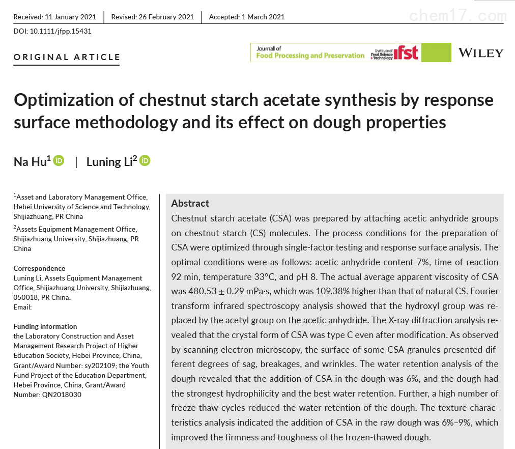 2021年,河北科技大学和石家庄学院研究人员联合在国际食品期刊《Journal of Food Processing and Preservation》(IF=2.190)发表了题为"Optimization of chestnut starch acetate synthesis by response surface methodology and its effect on dough properties“的研究论文。在该论文中,研究人员利用上海腾拔Universal TA研究型质构仪测定了面团的硬度和韧性。