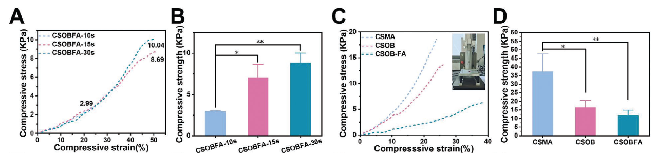 水凝胶的力学性质可以通过改变光照时间来快速改变,从而满足水凝胶对不同组织的需要。为了表征不同交联时间的CSOB-FA水凝胶的力学性质,对不同交联状况(10、15和30 s)的样品进行压缩测试。应力-应变曲线显示,随着交联时间的增加,水凝胶的刚性得到提升。随着光照时间的延长,CSOB-FA水凝胶的压缩模量显著增加(5 s CSOB-FA: 2.9 ±0.19 kPa, 15 s CSOB-FA: 7.04 ± 1.58 kPa, 30 s CSOB-FA: 8.84 ±1.34 kPa)。高强度交联有助于强水凝胶的形成,但是交联太多容易导致水凝胶相对变脆。为了获得具有合适强度和弹性的水凝胶,15s的一个交联时间被选择为zuiyou条件。在相同交联时间下,CSOB-FA水凝胶的压缩模量(11.94 ± 2.76 kPa)和CSOB的压缩模量(16.60 ± 3.51 kPa)显著低于单网络和单成分CSMA的压缩模量(37.39 ± 9.31 kPa)。这可能是由于双网络水凝胶中动态席夫键和氢键的存在,导致凝胶的力学性质不如具有CSMA自由基交联的单网络水凝胶。但是,具有自由聚合反应的单网络水凝胶相对脆性太高,可能不适合保护伤口免于动态变化。生理软组织的承载能力在10-200kPa之间。一般来说,CSOB-FA水凝胶的压缩模量使其适合作为脚手架用于生理软组织中细胞增殖、迁移和分化。