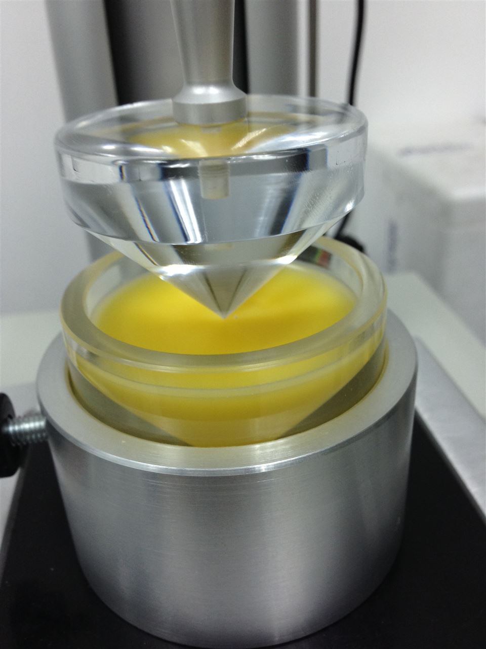 锥形探头用于软滑质地的流体、半流体,如果酱、冰淇淋、奶酪、黄油、肉糜等的稠度(consistence)、硬度(hardness)和延展性(extension)等流变特性测试。